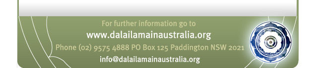 The other thing I'd like to do is to seek more involvement and feedback from the Buddhist community and indeed from anyone on this mailing list. We'd like to know what you liked or didn't like about the last visit, if you have any suggestions, how we can make his visit more relevant to you or your organisation. Are the public talks still relevant? Are his teachings too heavy? Is there another forum that may better suit his visit? Will a concert work? How do we reach out to the broader non-Buddhist community? Can we get young people fired up about His Holiness? Should the business community be courted? How can we draw in the Australian political spectrum, or should we even try? His office puts out strict guidelines for the visits so we are very mindful that we need to operate well within those rules, but the visit is for the Australian public, which is you, so we'd like to make it as inclusive as possible. Lynn has created an opportunity within this newsletter for your feedback, so please make use of it if you feel you have something useful to offer.