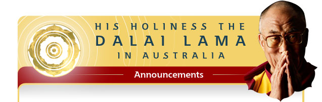 His Holiness will commence his Australian visit on the Queen's Birthday long weekend on the 11th June 2011. Over the course of the long weekend, His Holiness will be giving teachings on Shantideva's text "A Bodhisattva's way of Life". On the Saturday afternoon, His Holiness will also engage in a Public Conversation "On Happiness Life & Living - Karma & Reincarnation". Tickets for both these events are now on sale. Platinum tickets to the Melbourne Public Conversation have sold out and there are only a handful of A Reserve tickets left, so please don't delay if you wish to secure the best seats available.